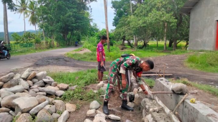Lembata – Sebagai bentuk nyata kemanunggalan TNI bersama rakyat, Babinsa Koramil 1624-04/Omesuri Praka Juphry melaksanakan kegiatan karya bakti membantu masyarakat yang sedang membangun rumah