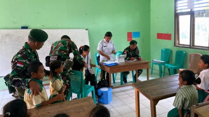 Satgas Pamtas RI–RDTL Sektor Timur Yonarmed 12 Kostrad melalui Pos Dafala membantu pelaksanaan kegiatan imunisasi bagi anak-anak di SDK Dafala, Desa Dafala, Kecamatan Tasifeto