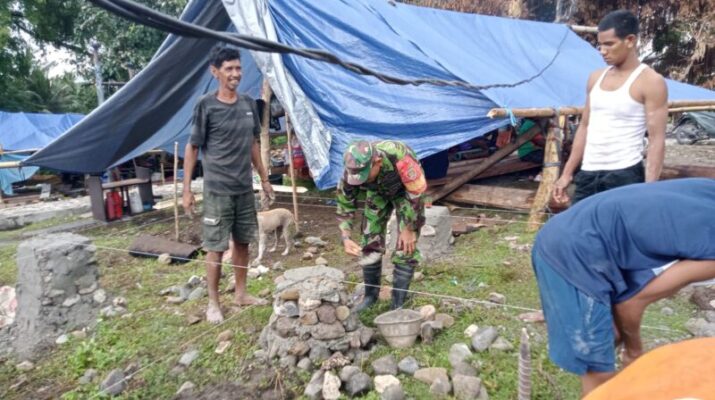 SUMBA BARAT – Sebagai wujud kepedulian dan kemanunggalan TNI dengan rakyat, Babinsa Koramil 02/Walakaka Kodim 1613/Sumba Barat, Serka Muslih, membantu warga membangun pondasi rumah
