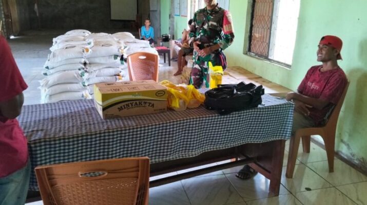 SUMBA TENGAH – Babinsa Koramil 03/Katikutana Kodim 1613/Sumba Barat, Sertu Ilham Lahiya, melaksanakan pendampingan penyerahan bantuan sosial (bansos) berupa beras dan minyak goreng kepada