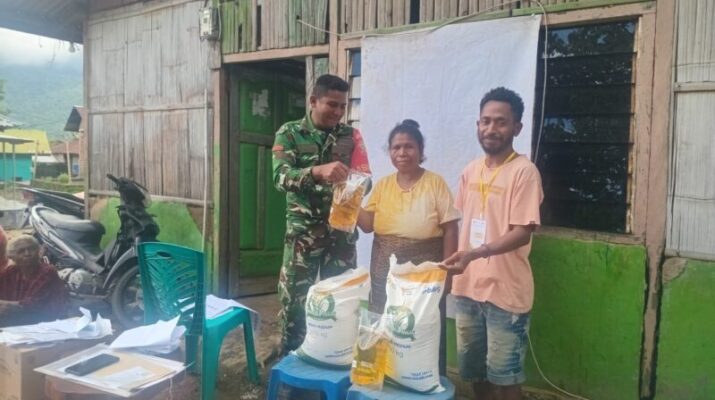 SUMBA TENGAH – Babinsa Koramil 03/Katikutana Kodim 1613/Sumba Barat, Sertu Ilham Lahiya, melaksanakan pendampingan penyerahan bantuan sosial (bansos) berupa beras dan minyak goreng kepada