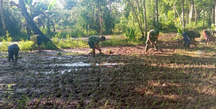 NTT – Sumba Timur. Babinsa Koramil 01/Lewa Kodim 1601/Sumba Timur, Praka Stepanus Ndapataka, melaksanakan kegiatan pendampingan kepada petani dalam proses penanaman padi di Desa