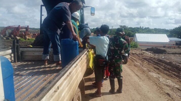 Lombok Tengah – Babinsa Desa Bonder Serka Muhil, Koramil 04/Prabar, Kodim 1620/Lombok Tengah, melaksanakan pendampingan dan pengawalan kegiatan perbaikan ruas jalan Penujak–Selong Belanak yang