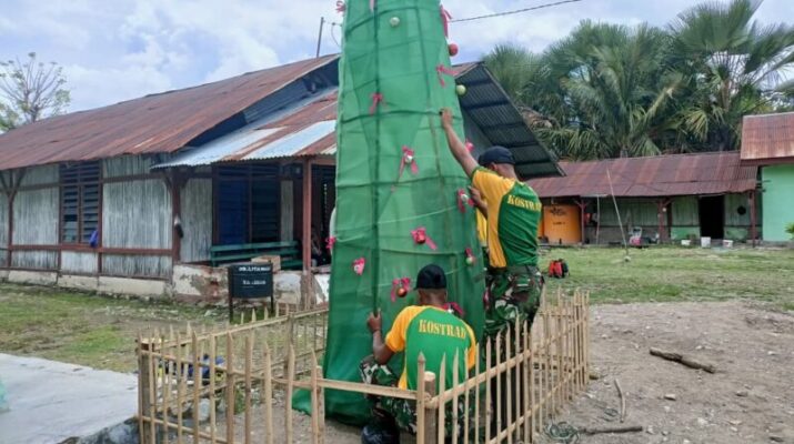 Kebersamaan di Perbatasan, Satgas Pamtas Pos Motamasin Percantik Gereja Sambut Natal