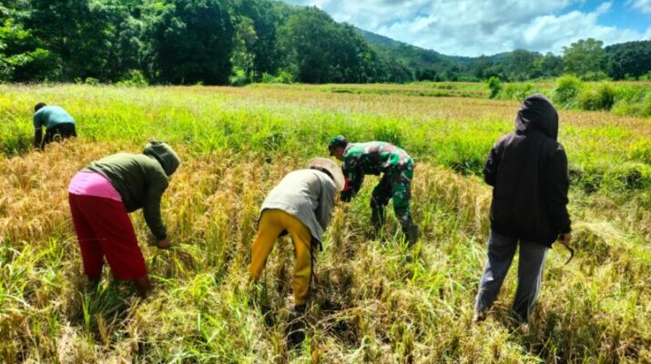 SUMBA TENGAH – Babinsa Koramil 03/Katikutana Kodim 1613/Sumba Barat, Sertu I Ketut Pastika, melaksanakan pendampingan kepada petani dengan membantu panen padi di Desa Umbu