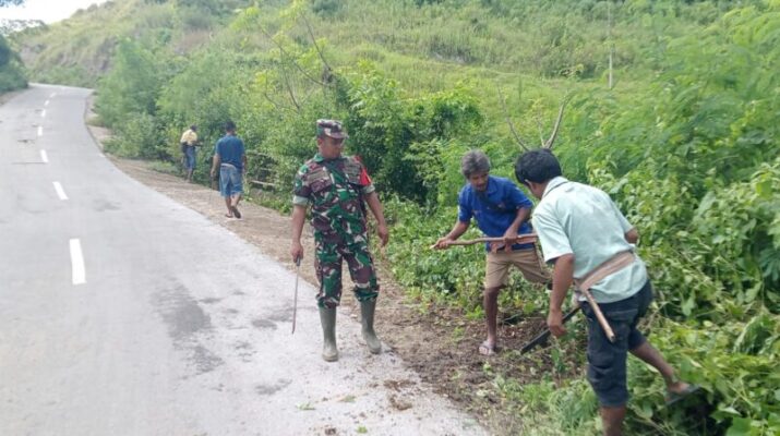 SUMBA BARAT – Babinsa Koramil 02/Walakaka Kodim 1613/Sumba Barat, Serka Ramli, melaksanakan kerja bakti bersama masyarakat membersihkan jalan dari semak belukar yang menghalangi pandangan