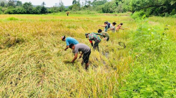 NTT – Sumba Timur. Babinsa Koramil 06/Karera Kodim 1601/Sumba Timur, Pratu Hezron Domu Wora, membantu petani melaksanakan panen padi di Desa Nangga, Kecamatan Karera,