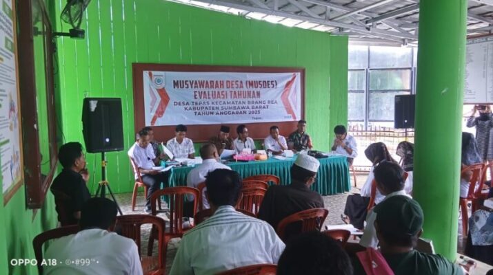 Sumbawa Barat, NTB — Babinsa Desa Tepas Koramil 1628-01/Taliwang, Serda Rusdiansyah, menghadiri kegiatan Musyawarah Desa (MUSDES) Evaluasi Tahunan Tahun Anggaran 2025 yang diselenggarakan Pemerintah