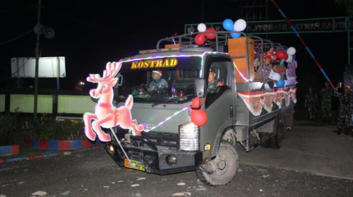 Eban – Suka cita dan kebersamaan pada malam Natal di perbatasan, Satgas Pamtas RI-RDTL Sektor Barat Yonarhanud 2 Kostrad hadirkan Kereta Santa Keliling dan