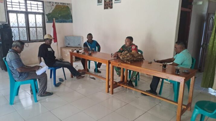 NTT-SIKKA. Babinsa Koramil 1603-05/Bola Kodim 1603/Sikka, Kopda Irsan Puloli, melaksanakan kegiatan komunikasi sosial (Komsos) bersama aparat Desa Natar Koli, Kecamatan Mapitara, Kabupaten Sikka, Sabtu