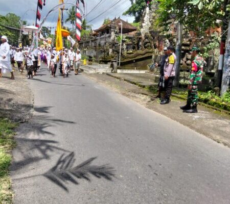 Tabanan – Babinsa Desa Beringkit Belayu Koramil 1619-06/Marga, Serda I Wayan Sardika, melaksanakan atensi dan pengamanan kegiatan Upacara Piodalan di Pura Dalem Batan Waru