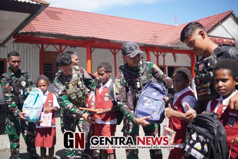 Senyum Anak-anak Kampung Pruleme, Distrik Mulia, Kabupaten Puncak Jaya, Papua, tampak merekah saat prajurit Satgas Yonif 743/PSY membagikan perlengkapan sekolah berupa tas dan alat tulis, Selasa (20/01/2026). Di tengah keterbatasan wilayah pegunungan, kepedulian ini menjadi cahaya harapan bagi masa depan generasi muda Papua.