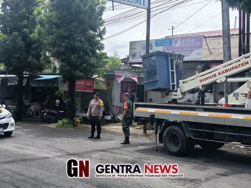 Gianyar – Sukawati, Rabu (21/1/2026) Dalam rangka menjaga keselamatan masyarakat serta mendukung kelancaran aktivitas di wilayah binaan, Babinsa Desa Celuk Koramil 1616-05/Sukawati Sertu I Komang Kamaryana bersama Bhabinkamtibmas Desa Celuk Aipda I Made Diata melaksanakan pengamanan dan pengaturan arus lalu lintas pada kegiatan penurunan papan reklame bertuliskan “Selamat Datang di Kota Kecamatan Sukawati Bersemi”. Kegiatan tersebut berlangsung di sebelah barat Jembatan Cencengan, tepatnya di Jalan Raya Celuk, wilayah Desa Adat Cemenggaon, Kecamatan Sukawati, Kabupaten Gianyar.