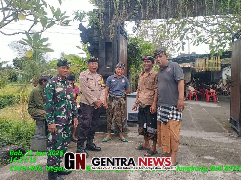 Klungkung,- Sinergi dan dedikasi terbaik untuk menghadirkan keamanan dan kelancaran kegiatan upacara keagamaan, Babinsa Negari Koramil 1610-02/Banjarangkan Serka Gede Adiasa menggelar pengawalan dan pengamanan, bersama Bhabinkamtibmas dan pecalang, Rabu ( 21/01/26 ).