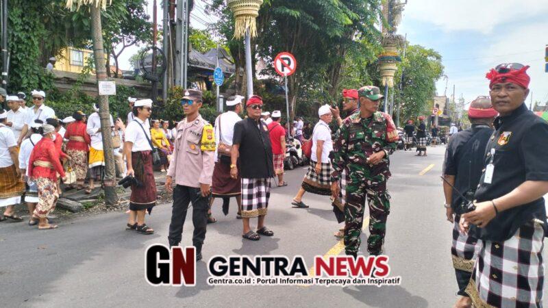 Dalam mendukung kelancaran prosesi, Babinsa bersama Bhabinkamtibmas dan Pecalang bersinergi melaksanakan pengamanan terpadu dengan melakukan pengawalan sepanjang jalur yang dilalui warga, pengaturan serta buka-tutup arus lalu lintas, sekaligus memberikan ruang dan kesempatan bagi pengguna jalan lainnya agar aktivitas masyarakat tetap berjalan tertib.