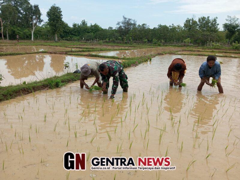 SATGASTER KODIM 1605/BELU, Anggota Satgaster Kodim 1605/Belu Pos Halibete 2 Serda Hironimus Kono membantu menanam padi milik Bapak Yohanes Mali petani di Desa Fatulotu, Kecamatan Lasiolat, Kabupaten Belu NTT, Sabtu (24/1/2026).