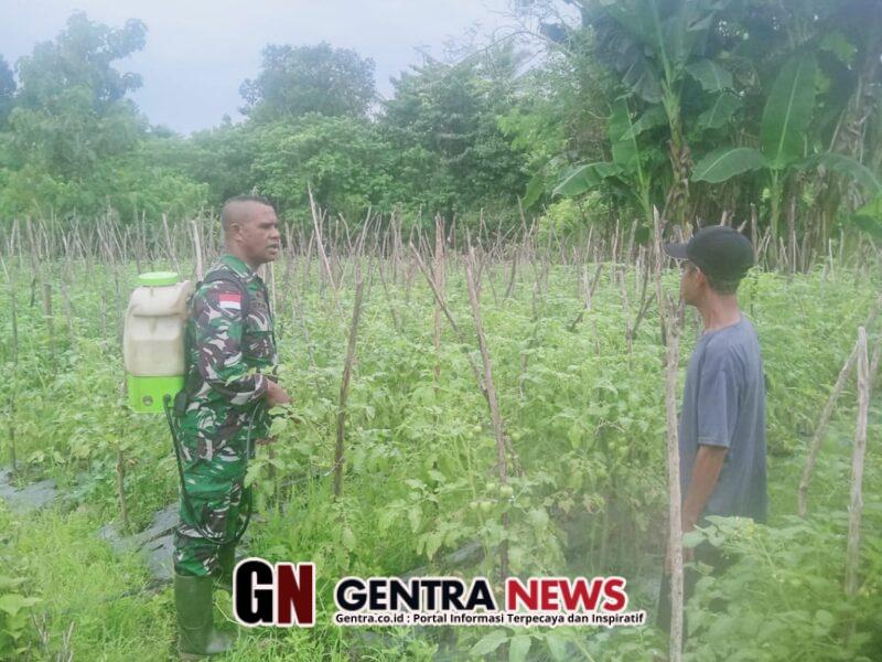 • Dampingi Petani, Serda Hironimus Kono Lakukan Penyemprotan Pemupukan Pada Tanaman Tomat