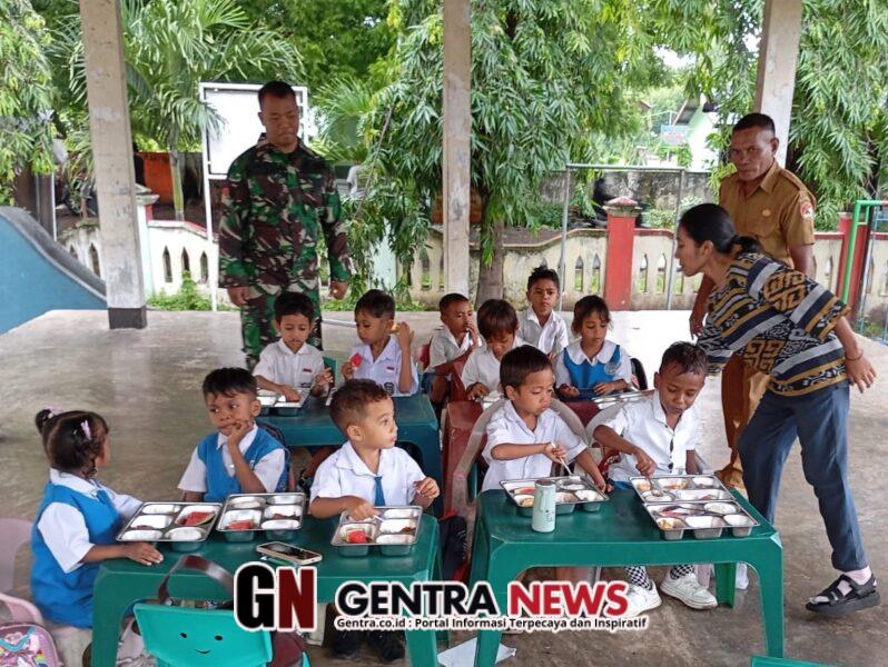 NTT-SIKKA, Babinsa Koramil 1603-01/Alok Kodim 1603/Sikka, Praka Aris Wijayanta, melaksanakan kegiatan pendampingan pembagian Makan Bergizi Gratis di PAUD Sayang Anak, Kelurahan Madawat, Kecamatan Alok, Kabupaten Sikka, Selasa(27/01/2026).