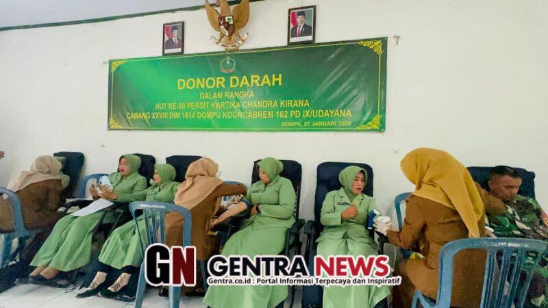 Dompu,NTB – Dalam rangka memperingati Hari Ulang Tahun (HUT) ke-80 Persit Kartika Chandra Kirana, Persit KCK Cabang XXVIII Kodim 1614/Dompu Koorcabrem 162 PD IX/Udayana menggelar kegiatan donor darah, Selasa (27/1/2026). Kegiatan tersebut berlangsung di Aula Makodim 1614/Dompu, Jalan Ahmad Yani, Kelurahan Dorotangga, Kecamatan Dompu, Kabupaten Dompu.