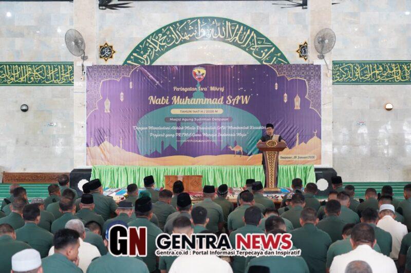 Denpasar – Ratusan jamaah memenuhi Masjid Agung Sudirman, Denpasar, saat Kodam IX/Udayana menggelar Peringatan Isra Mikraj Nabi Muhammad SAW 1447 H/2026 M, pada Rabu (28/1/2026). Kegiatan yang diikuti sekitar 400 peserta itu mengusung tema “Dengan Meneladani Akhlak Mulia Rasulullah SAW Membentuk Karakter Prajurit yang PRIMA Guna Menuju Indonesia Maju.”