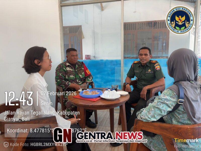 Gianyar – Tegallalang, Senin (2/2/2026) Guna memastikan program pemerintah berjalan dengan baik dan tepat sasaran, Danramil 1616-06/Tegallalang Kapten Inf Cok Agung Semadi didampingi Babinsa Desa Tegallalang Sertu I Gusti Putu Arbajaya melaksanakan anjangsana sekaligus peninjauan langsung ke Sentra Produksi Pangan Gizi (SPPG) Desa Tegallalang, yang berlokasi di Banjar Gentong, Desa Tegallalang, Kecamatan Tegallalang, Kabupaten Gianyar.