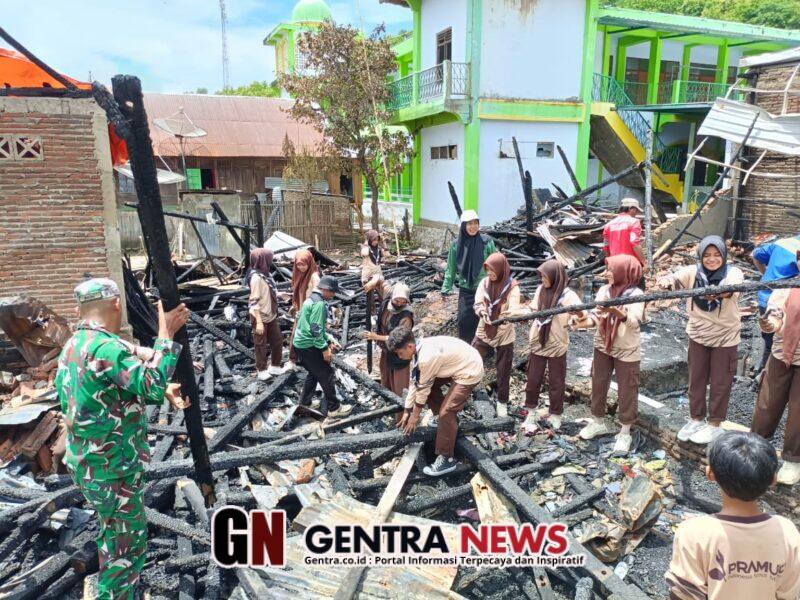 Kegiatan gotong royong berjalan dengan semangat kebersamaan demi memulihkan kondisi lingkungan yang terdampak musibah kebakaran. Para peserta bekerja sama secara tertib, lancar, dan penuh kekompakan, menunjukkan sinergi antara aparat dan masyarakat desa.