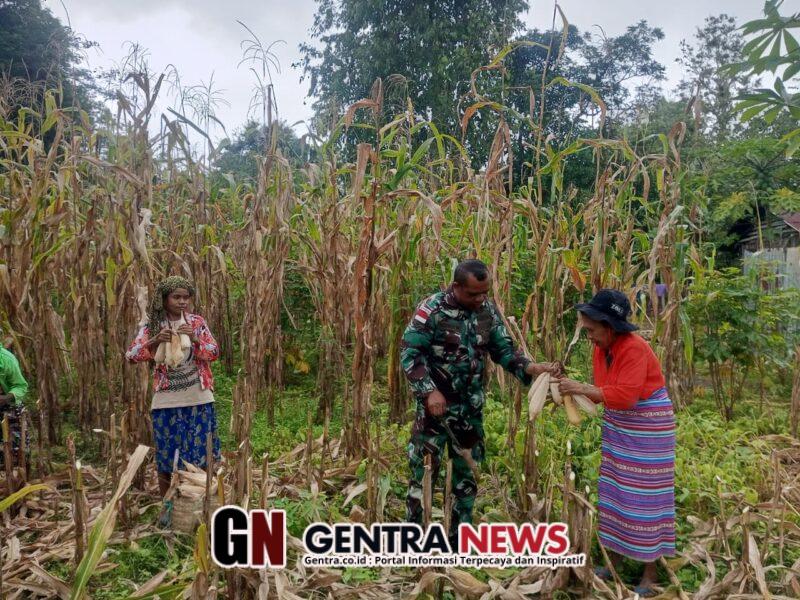 SATGASTER KODIM 1605/BELU, Dalam rangka mendukung peningkatan ketahanan pangan di wilayah perbatasan, Anggota Satgaster Kodim 1605/Belu Pos Halibete 2 Serda Hironimus Kono terlibat dalam kegiatan panen jagung hibrida pada lahan milik Bapak Martinus Seuk warga Dusun