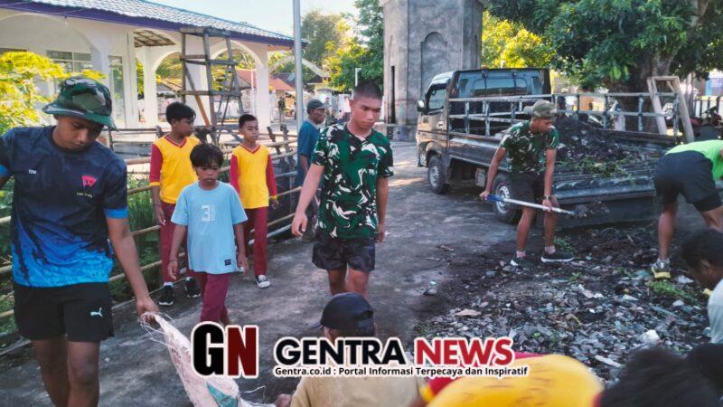 Prajurit dan masyarakat terlihat bekerja bersama dengan penuh semangat, mencerminkan nilai kebersamaan serta kepedulian terhadap lingkungan dan sarana ibadah.