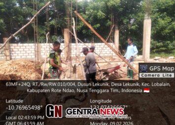 Rote Ndao — Babinsa Koramil 1627-03/Batutua, Kopda Noh Nubatonis, melaksanakan pendampingan kegiatan penyelesaian pemasangan pondasi bagian tengah pembangunan Konstruksi Dermaga Kapal Motor Penyeberangan (KDKMP) di Desa Mundek, Kabupaten Rote Ndao, pada Senin (9/2/2026).
