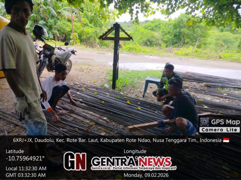 Rote Ndao — Babinsa Koramil 1627-03/Batutua, Koptu Yoseph Gunawan Seran, melaksanakan pemantauan kegiatan pembuatan behel untuk tiang cakar ayam sebagai bagian dari proses pembangunan infrastruktur di wilayah Desa Tualima, Kecamatan Rote Barat Laut, Kabupaten Rote Ndao, pada Senin (9/2/2026).