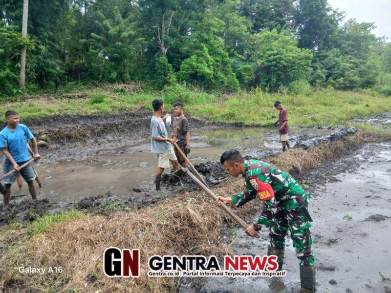 Babinsa bersama petani setempat bergotong royong memperbaiki dan membangun pematang sawah guna menunjang pengairan serta mencegah kebocoran air ke petak sawah lainnya.