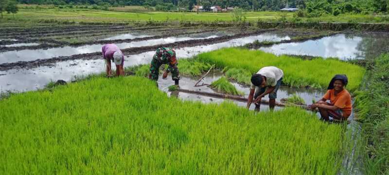 Dalam kegiatan ini, Babinsa turut membantu petani mencabut bibit padi sebagai bagian dari persiapan masa tanam.