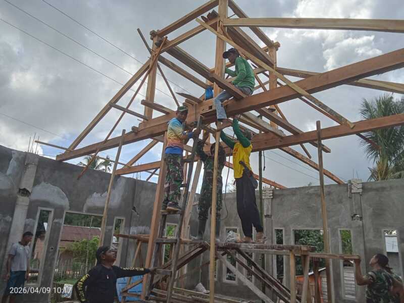 Dalam pelaksanaan karya bhakti, anggota Koramil bersama warga melanjutkan pemasangan kuda-kuda atap mushollah agar proses perbaikan dapat segera rampung. Pemasangan kuda-kuda atap menjadi tahap penting demi menjaga kokohnya struktur bangunan sekaligus memastikan kenyamanan jamaah yang menggunakan mushollah tersebut.