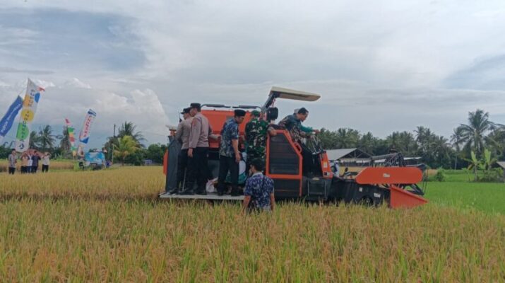 Danramil 1615-11/Aikmel, Kapten Inf. Abdul Wahab, bersama para Babinsa se-Kecamatan Lenek menghadiri kegiatan Panen Raya Padi Kelompok Tani Omba Selatan II yang berlangsung di