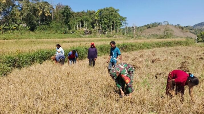 SUMBA BARAT – Babinsa Koramil 02/Walakaka Kodim 1613/Sumba Barat, Serka Muslih, melaksanakan kegiatan Komunikasi Sosial (Komsos) sekaligus membantu warga melakukan panen padi di Desa
