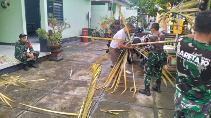 Klungkung,- Suasana penuh kebersamaan tampak mewarnai Makoramil 1610-03/Dawan saat digelarnya gotong royong penyiapan upacara piodalan di Pura Makoramil Dawan, Rabu ( 02/12/25 ). Sejak