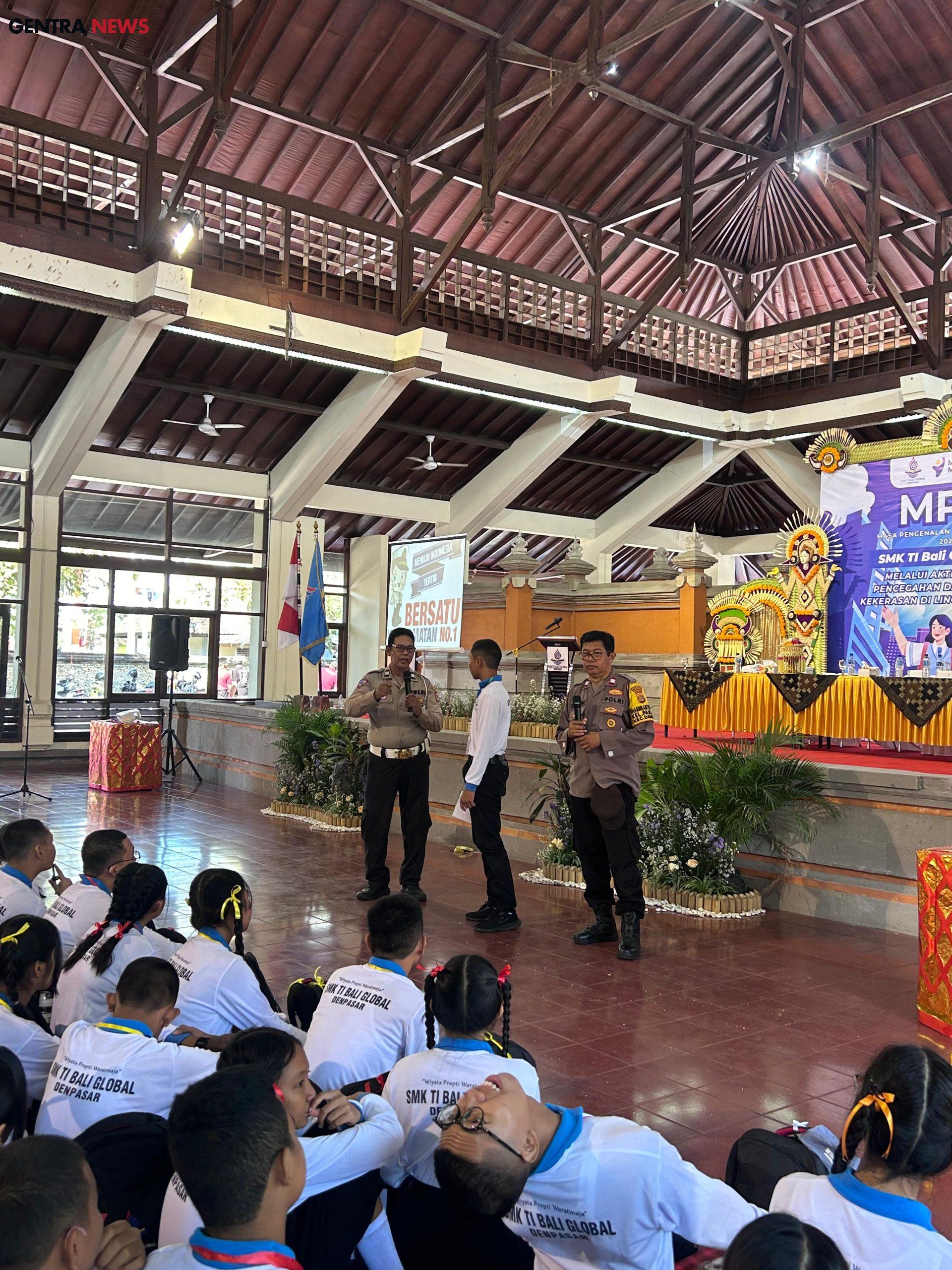 Gentra News Bali – Denpasar, Memasuki tahun ajaran baru Bhabinkamtibmas Kelurahan Panjer Aiptu Ketut Suartama bersama dengan Personil Lantas Polsek Densel Aiptu Wayan Suarna memberikan materi tertib berlalu lintas kepada Siswa baru dalam kegiatan Masa Perkenalan Lingkungan Sekolah (MPLS) SMK TI Bali Global tahun ajaran 2024/2025 bertempat gedung Narigraha Jalan Cut Nyak Dien Denpasar. Senin (15/7/2024) pagi