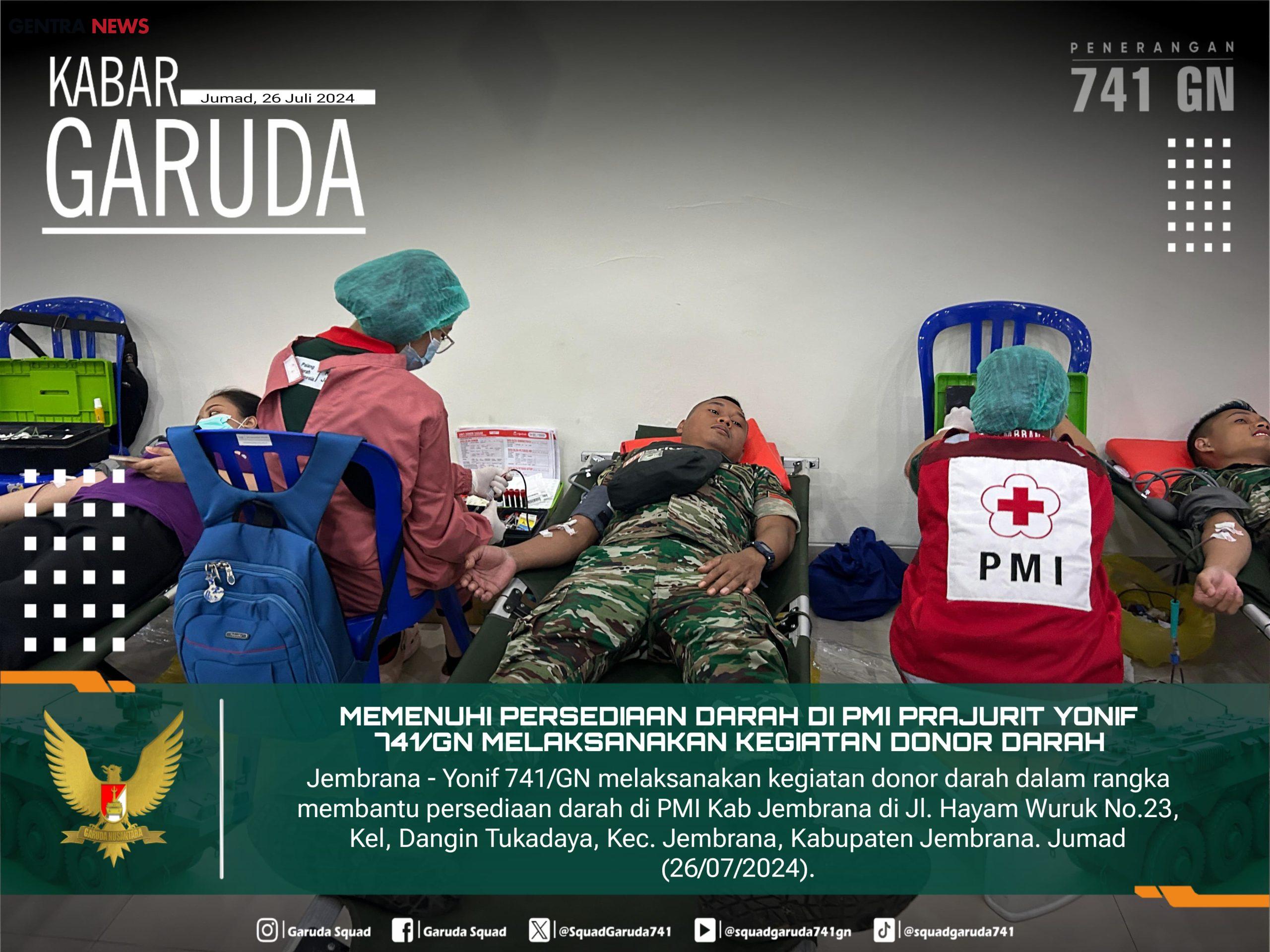 Gentra News Bali-Jembrana – Yonif 741/GN melaksanakan kegiatan donor darah dalam rangka membantu persediaan darah di PMI Kab Jembrana di RSU Balimed Jl. Hayam Wuruk No.23, Kel, Dangin Tukadaya, Kec. Jembrana, Kabupaten Jembrana. Jumad (26/07/2024).