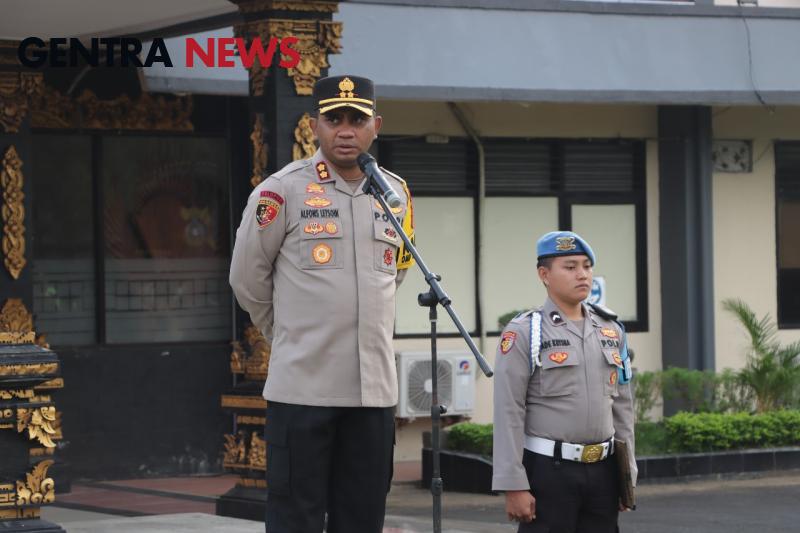 Kapolres Klungkung AKBP Alfons W.P. Letsoin,S.I.K., menyampaikan pertama tama marilah kita panjatkan puj syukur kehadapan tuhan yang maha esa atas berkat dan rahmatnya pada pagi ini kita dapat berkumpul di lapangan Apel Polres Klungkung dalam keadaan sehat.
