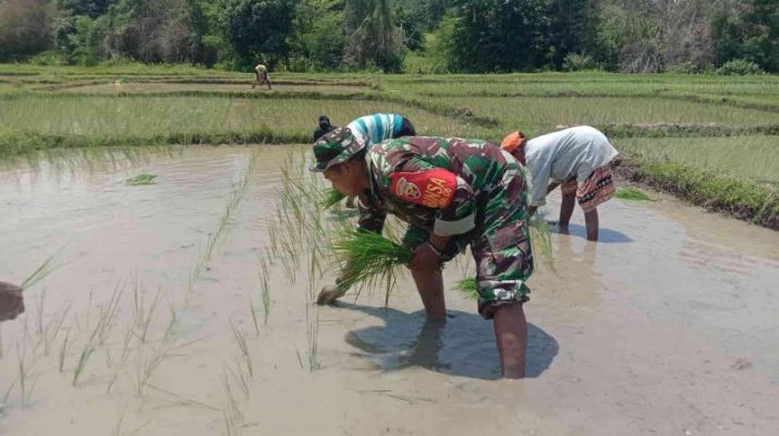 Gentra News NTT – KODIM 1605/BELU, Babinsa Desa Naekasa Koramil 1605-06/Halilulik Sertu Agus Ati.turun ke sawah membantu Bapak Petrus Talam seorang petani di Dusun Wekabu, Desa Naekasa, Kecamatan Tasifeto Barat menanam bibit padi di Area persawahan nya, Senin (27/1/2025).