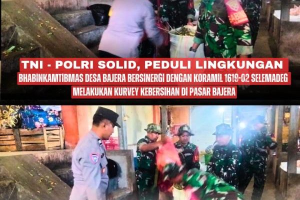 Gentra.co.id Bali – Polres Tabanan – Polsek Selemadeg, Selasa, 11 Maret 2025, Pkl. 07:30 s/d 09:20 Wita. Aiptu I Dewa Nyoman Bagiana, Bhabinkamtibmas Desa Bajera, bersama anggota Koramil 1619-02 Selemadeg, melakukan kurve kebersihan di Pasar Bajera. Kegiatan ini merupakan wujud nyata kepedulian terhadap lingkungan dan sinergisitas antara Aparat Keamanan dalam menciptakan pasar yang bersih dan nyaman.