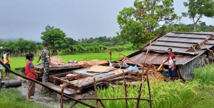 Babinsa Sertu Junus Ratu bersama perangkat desa dan warga setempat langsung membersihkan puing rumah yang roboh.