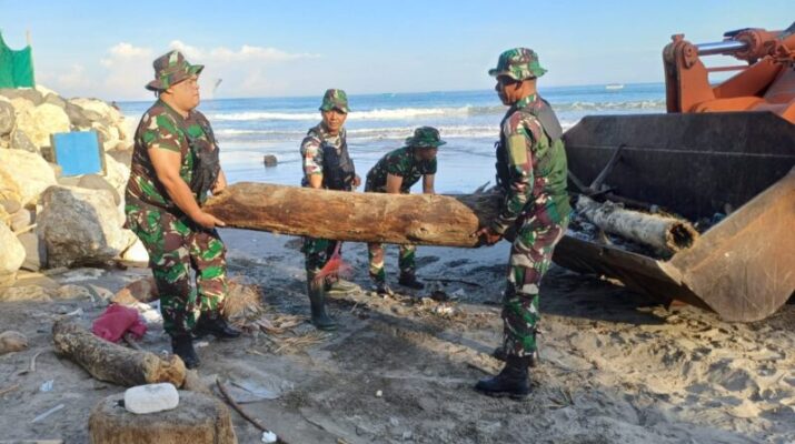 Personel gabungan ini bekerja sama untuk membersihkan sampah plastik, batang pohon kayu dan bambu serta sampah lainnya, di sepanjang pantai.