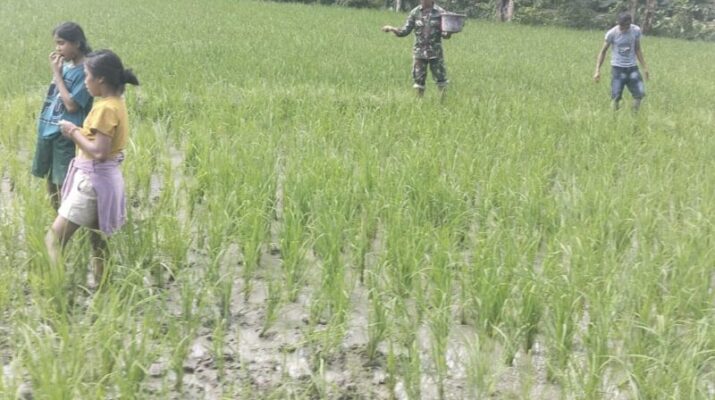SUMBA BARAT – Wujud kepedulian terhadap ketahanan pangan di wilayah binaan, Babinsa Koramil 02/Walakaka Kodim 1613/Sumba Barat, Sertu Alifin, melaksanakan pendampingan kepada para petani dalam kegiatan pemberian pupuk pada tanaman padi di Desa Kabukarudi, Kecamatan Lamboya, Kabupaten Sumba Barat, Senin (30/6/2025).