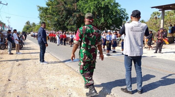 NTT-SABU RAIJUA, – Dalam rangka memeriahkan Hari Ulang Tahun Kemerdekaan Republik Indonesia ke-80 Tahun 2025, Babinsa Sabu Timur Koramil 1604-08/Sabu Raijua, Serma Ama Sutrisno Lay bersama Sertu Jordi Nara Haba melaksanakan pengamanan sekaligus menjadi juri pada perlombaan gerak jalan antar pelajar tingkat SD, SMP, dan SMA se-Kecamatan Sabu Timur. Kegiatan ini berlangsung meriah dan penuh antusiasme dari peserta maupun masyarakat yang hadir. Kamis (14/08/2025).