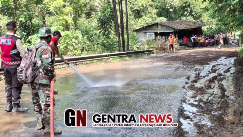 Proses pembersihan material longsor dilaksanakan secara gotong royong dengan menggunakan peralatan manual, alat berat, serta bantuan semprotan air untuk membersihkan lumpur yang menutupi badan jalan.