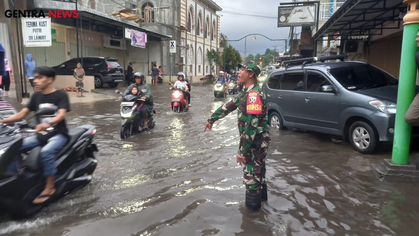 Sertu Nyong Hamid, Babinsa Karang Pule, dengan sigap turun ke jalan mengamankan lalu lintas yang terganggu akibat genangan air di Kelurahan Karang Pule, Kecamatan Sekarbela, Kota Mataram, Selasa Sore (3/7/2024).