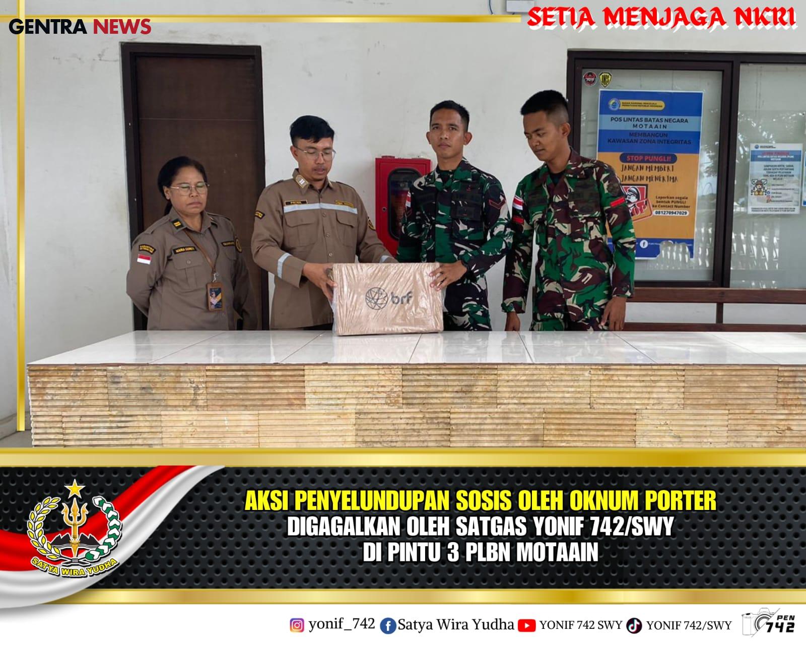 Penangkapan terduga pelaku beserta barang bukti 1 dos sosis bermula kecurigaan personel Satgas terhadap gerak gerik terduga pelaku inisial LB (Oknum Porter PLBN Motaain) yang membawa paketan dalam satu dos disaat Portal PLBN Motaain akan tutup untuk melaksanakan istirahat siang, menduga barang tersebut ilegal, kemudian Serda Ahmad dan Pratu Mustopa personel Satgas Yonif 742/SWY serta personel Karantina Pos Motaain yang berjaga di Pintu Portal tersebut menghampiri terduga pelaku dan menanyakan isi dalam dos tersebut (sosis) serta kelengkapan izin masuk dari kementrian kesehatan. Namun terduga pelaku tidak dapat menunjukkan kelengkapan administrasi terhadap barang bawaannya. Menduga barang tersebut masuk ke Indonesia secara ilegal sehingga personel satgas menyerahkan kepada pihak Karantina PLBN Motaain untuk menindaklanjuti terkait dugaan pelanggaran tersebut.