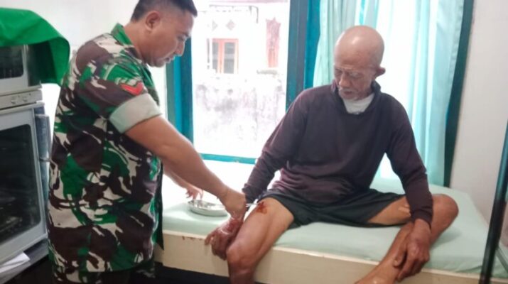 Anggota Provost Kodim 1623/Karangasem Pelda I Komang Alit dan Koptu I Gede Guru memberikan bantuan pertolongan pertama kepada Warga berinisial IMS yang mengalami kecelakaan, pada Selasa (10/06/25)