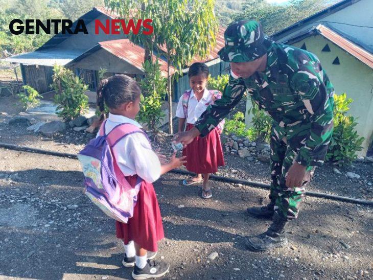 Gentra News NTT – SATGASTER KODIM 1605/BELU, Demi keamanan dan kelancaran di perjalanan, Anggota Satgaster Kodim 1605/Belu Pos Lakus Sertu Henri Rumamalete memberikan himbauan serta mengingatkan kepada para Siswa dan Siswi SD agar selalu berhati-hati ketika hendak pulang sekolah.